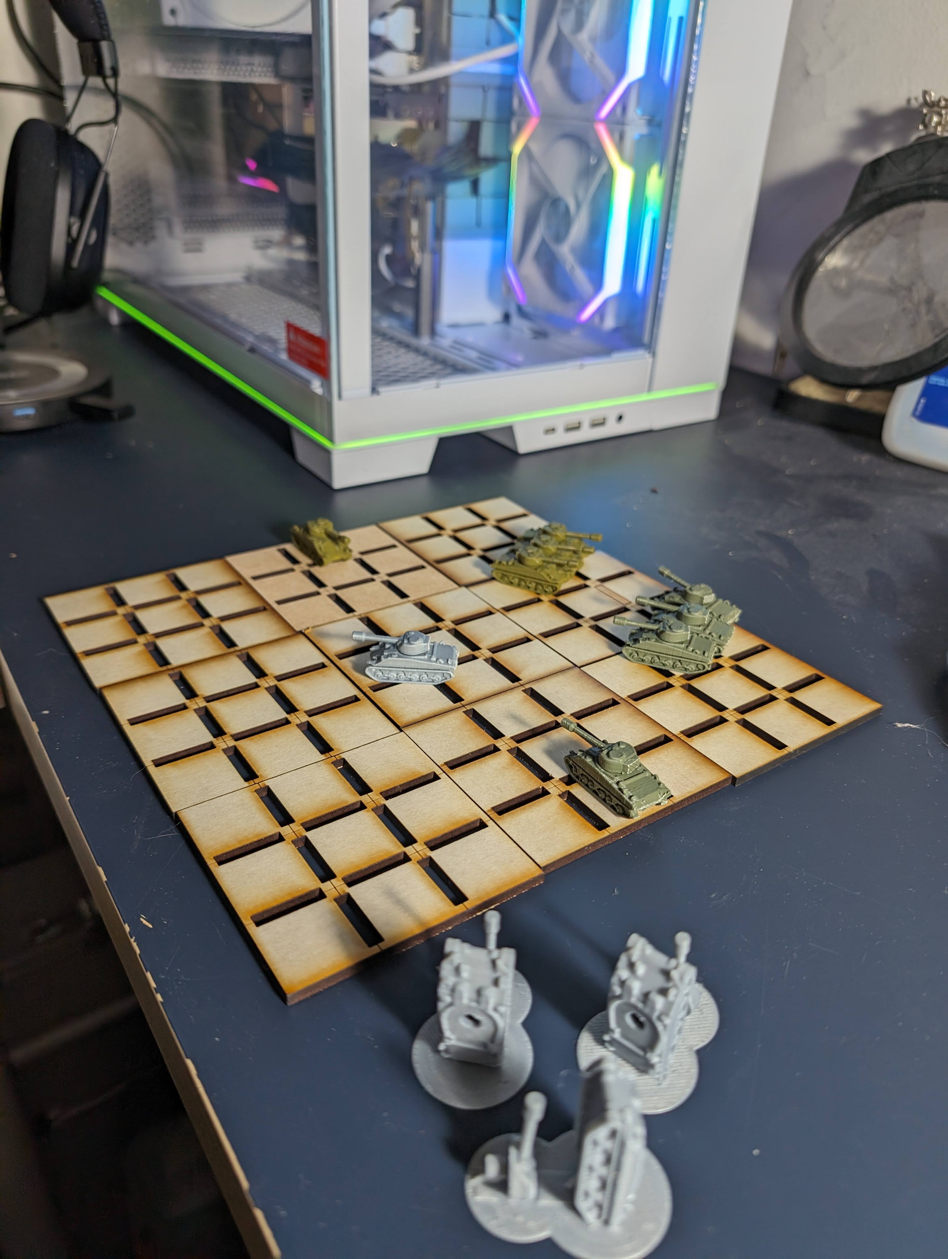 Each player draws six action cards from their deck. Discard two and place the remaining four face down in a pile. All players reveal cards one at a time simultaneously maneuvering their tank according to the revealed card. Once all four cards are revealed all tanks fire simultaneously, hits are resolved, and the loop begins again.